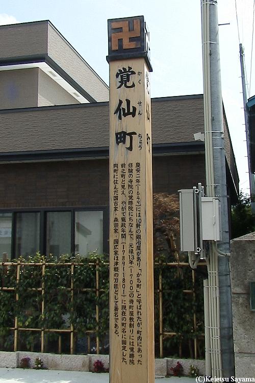 慶安二年(1649)には10軒の鍛冶屋があり「かち町」と呼ばれたが、町内にあった修験の寺院の覚勝院にちなんで、元禄13年(1700)の侍町屋敷割には覚勝院前之町とされ、やがて寛政年間(1789~1801)に現在の町名に固定した。同町に住んだ国吉家・森宗家・国広家は津軽の刀匠として著名である。(標柱転載)