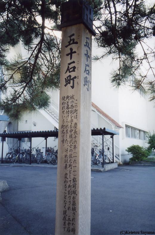 弘前の古町名標柱 五十石町五十石町(ごじっこくまち)この町は慶長十六年(一六一一)弘前城が築城された時、城の西側を守る中級武士の住む町として町割りされ、五十石町と名付けられました。それ以来、変わることなく現在まで使われている町名です。(標柱転載)五十石町周辺の標柱地図・クリックすると拡大五十石町標柱(弘前市民体育館横に設置)五十石町の標柱から北西へ行くと、重要文化財の誓願寺山門があります。誓願寺山門付近は下新町と呼ばれているところで、下新町ねぷた愛好会のねぷた小屋があります。誓願寺山門をかたどった下新町ねぷた愛好会の町印