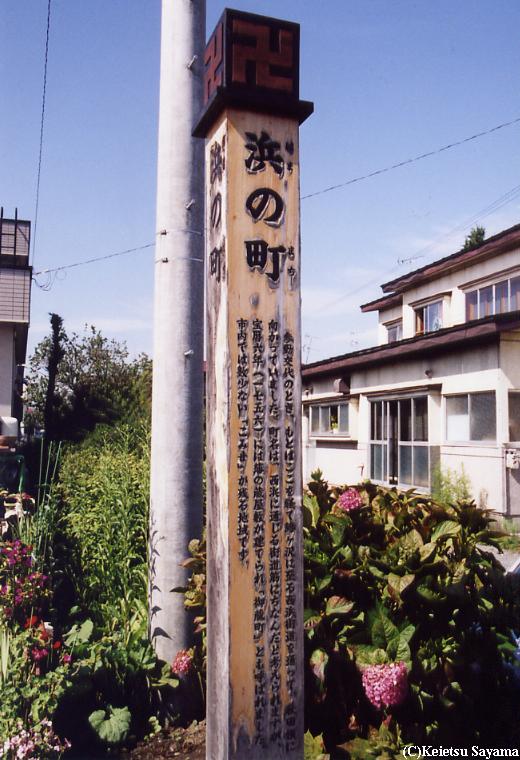 弘前の古町名標柱 浜の町昨日まで紹介した紺屋町から北の富士見橋に行くと浜の町が見えます。弘前市街でも北の地区にある標柱を紹介していきます。浜の町(はまのまち)参勤交代のとき、元はここを経て鯵ヶ沢に至る西浜街道を通って、秋田領に向かっていました。町名は、西浜に通じる街道筋にちなんだと考えられますが、宝暦六年(1756)には藩の蔵屋敷が建てられ『御蔵町』とも呼ばれました。市内では数少ない「こみせ」が残る地域です。(標柱転載)浜の町周辺の標柱地図・クリックすると拡大浜の町標柱(弘南バス・浜の町停留所近くに設置)弘前浜の町郵便局