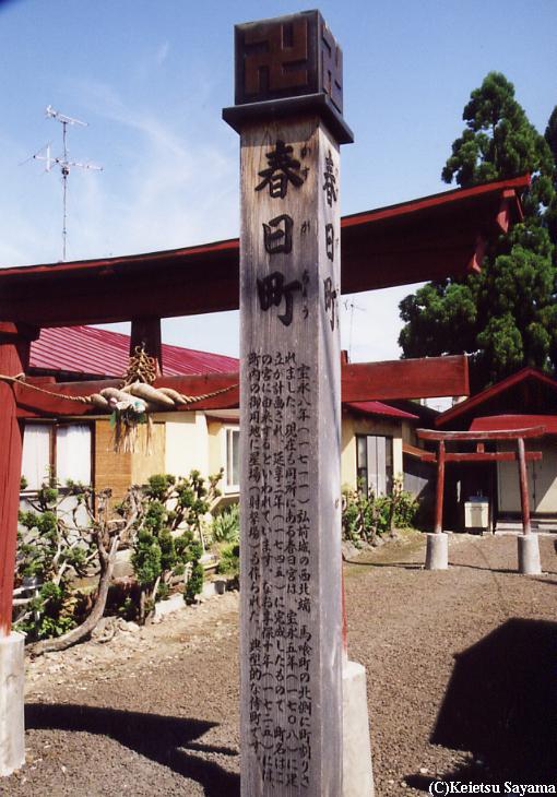 弘前の古町名標柱 春日町春日町(かすがちょう)宝永八年(1711)弘前城の西北端 馬喰町の北側に町割されました。現在も同所にある春日宮は、宝永五年(1708)に建立が計画され、延享二年(1745)に完成したもので、町名はこの宮に由来するといわれています。なお享保十年(1725)には町内の御用地に星場(射撃場)も作られた、典型的な侍町です。(標柱転載)春日町周辺の標柱地図・クリックすると拡大春日町標柱(春日大神前に設置)