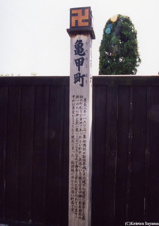 弘前の古町名標柱 亀甲町亀甲町(かめのこまち)慶長八年(一六〇三)藩祖為部が新城築城とその城下の建設に着手した最初の町割りが当地であったといわれ、兵法にいう城を守る四神(東西南北の神)の北の神玄武(亀のこと)にちなんで命名されたと伝えられています。それ以来、変わることなく現在に至った弘前城にゆかりの深い町名です。亀甲町周辺の標柱地図・クリックすると拡大亀甲町標柱(みちのく銀行亀甲町支店の向かいに設置)弘前亀甲町郵便局…建替前弘前亀甲町郵便局…建替後弘前亀甲町郵便局の証印(主務者印)・画像をクリックすると拡大されます