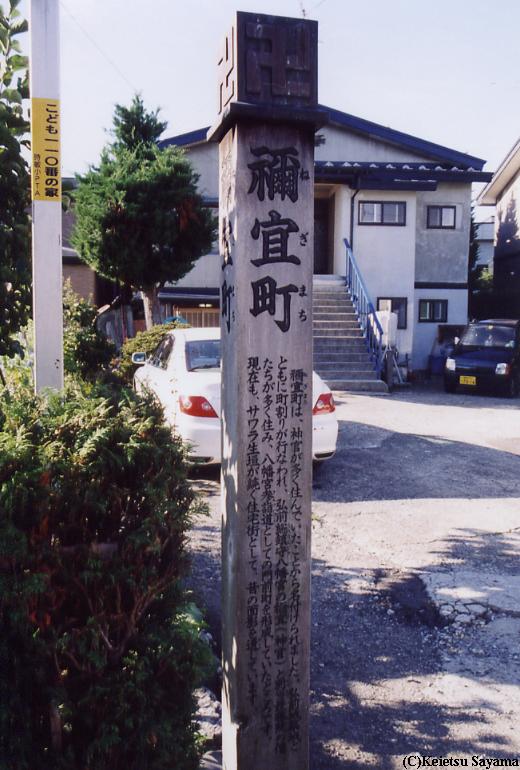 禰宜町は、笹森町から北へ抜ける小道に行くとあります。かなり目立たないところにあるので見落としがちです。車で禰宜町の標柱から大通りに抜けるには、サワラ生垣が両脇から迫ってくるほど細い路地を曲がりくねって行かなければなりません