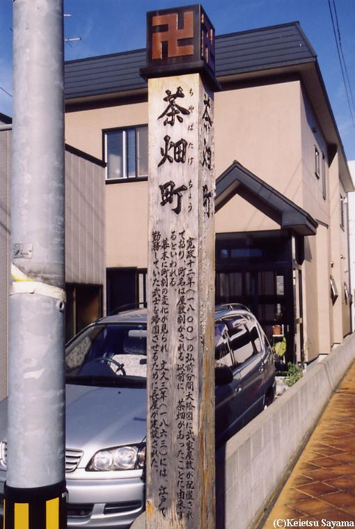 寛政十二年(1800)の弘前分間大絵図に武家屋敷が配置されており、町名は屋敷割がされる以前に、茶畑があったことに由来するといわれる。幕末に町割の変化が見られ、文久三年(1863)には、江戸で勤務していた武士を帰国させるために長屋が建設された。