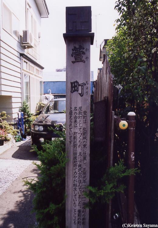 萱町は、弘前城の東に位置し、正徳元年(1711)屋敷町としてつくられ、主に下級武士が住んでいました。萱町の町名の由来は、町割り以前は田園地帯でカヤが群生していたことによると伝えられています。