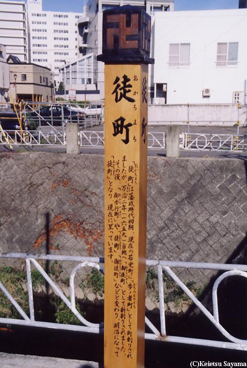 「徒町(おかちまち)」は藩政時代初期、現在の若党町に「歩ノ者町(かちのものまち)」として町割りされましたが、万治(まんじ)二年(1659)当地へ「御徒町(おかちのまち)」として新割りされました。その後、「御歩行町(おかちのまち)」や「徒町(おかちのまち)」「御徒町(おかちのまち)」などと変わり、明治になって「徒町(おかちまち)」となり、現在に至っています。