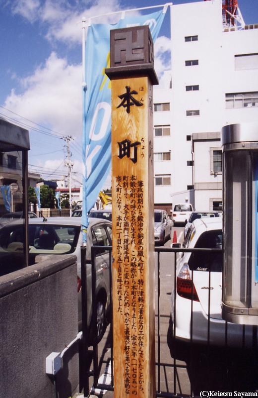 藩政初期から鍛冶や銅屋の職人町で、特に津軽の著名な刀工が住んでいたことから、本鍛冶町の呼び名が生まれ、この略称から本町となりました。宝永二年(1705)の町割りで、大半が南門(現 追手門)に変わったため、やがて豪商が軒を並べる代表的な商人町になり、本町一丁目から五丁目と呼ばれました。