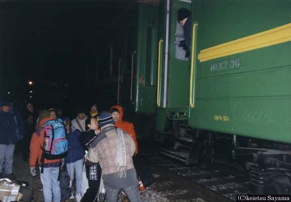 今夜は観測地シルカまでシベリア鉄道に乗って行きます。チタは22:00発ですが、駅にはホームがありません。大量の荷物を手分けして運びます。鉄路からタラップまで約1.5mあるので重い荷物を懸垂して運ぶのは大変(>_<) 寒さも吹き飛んだ。