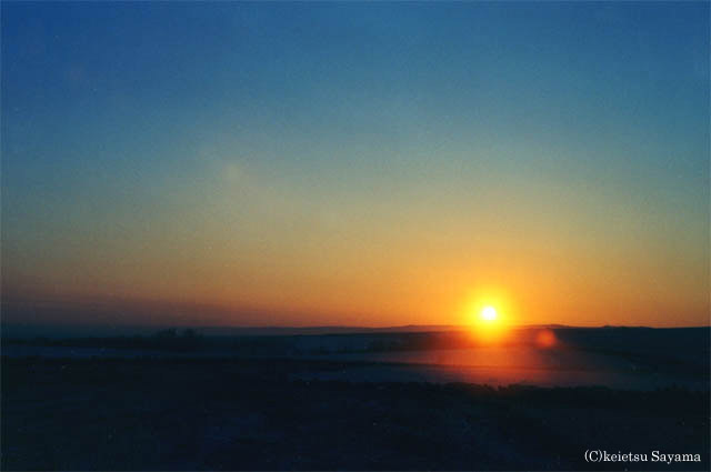 完全な快晴の下で斜めに陽が昇りました。荒野に浮かぶ太陽は、日本では見られないような美しさです。