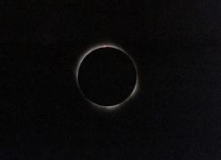 同時にピンク色のプロミネンスも見えていて、その廻りに二つの惑星が輝いていました。左斜め上は水星で、右斜め下は木星です。天頂に近い皆既日食なので、皆既特有の夕暮れ状態が地平線の全てを覆いました。それが太陽方向に移動した瞬間、月の谷から光が漏れてダイヤモンドリングになり皆既日食も終わりました。皆既日食中でも2台のカメラを駆使して撮影に没頭しているので、時間の経つのもあっという間です。感動の余韻に浸る時間はいつも短く、太陽は元の姿に戻りながら地平線方向に向かってゆっくりと沈んでいきます。