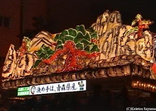 県庁ねぶた実行委員会項羽の馬投げ ねぶた師 穐元 和生項羽の馬投げ・裏絵県庁ねぶた実行委員会県庁ねぶた実行委員会のねぶたは“項羽の馬投げ”です。元の絵は馬が放り投げられているところでしたが、ねぶたになると高さ制限があるので馬が正面を向いています。ちなみに高さ5m、横幅9m以内に抑えないとねぶたは運行されません。この制限枠にねぶたの骨組みを収めるのもねぶた師のシゴトです。