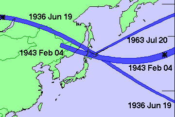 北海道では、1936年6月19日から1963年7月21日までの間に3回も見られました。この頃の北海道は、日食銀座と呼ばれていました。地図の日付は世界時です。