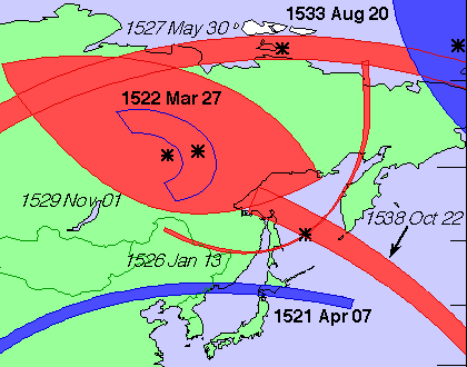 右の図は、金環日食帯に皆既日食帯が封入されたような珍しい日食経路図です。いずれのサロスもこれから成長期に入るもので、成長期サロス特有の形状となっています。極地方で起こる日食は、太陽の光が斜めに入ります。それに伴って、本影錐(月の影の円錐)や擬本影(本影からはみ出した光環)も斜めになります。その結果、大地に幅広く伸びた影が皆既日食や金環日食などの中心食の幅を広げることにもなります。この地図は、1522年3月27日に皆既日食が起こり、1529年11月1日で金環日食が起こったために金環日食を示す赤で塗りつぶされています。…つまり、皆既日食が見られた極狭い範囲を囲むように金環日食が見られたと言う珍しい日食です。それも全ての経過がロシア国内の陸地で見られた珍しいケースです。
