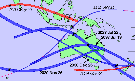 以下の図は、2021年から2040年にかけて見られるオセアニアと南米の日食帯です。この時期のオセアニアでは皆既日食帯が集中して通過するのに対し、南米では金環日食しか見られないことが分かります。