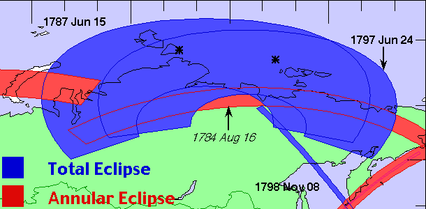 真ん中の図は1787年6月15日に起こった皆既日食帯で、一番下の図は1797年6月24日に起こった皆既日食です。