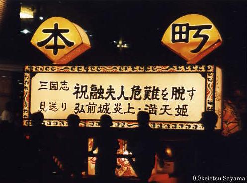 1998年 弘前ねぷた 11998年8月1日~3日までに運行されたねぷたを紹介します。場所は青森県弘前市中土手町にて撮影しました。弘前ねぷた合同運行樹木ねぷた愛好会・絵師 長谷川 壽一樹木ねぷた愛好会(町印)金魚ねぷた津軽為信出撃(鏡絵)勇婦(見送り絵)城南ねぷた愛好会・絵師 長谷川 壽一城南ねぷた愛好会(町印)ねぷた下部(ひらき・額絵)蜀の王平岑威を一刀に斬る(鏡絵)楽女(見送り絵)茂森新町ねぷた同好会・絵師 三浦 呑龍茂森新町ねぷた同好会(町印)茂新の寅源 頼光 鬼退治の図(鏡絵)蛇姫(見送り絵)本町ねぷた愛好会・絵師 三浦 呑龍本町ねぷた愛好会(町印)本町ねぷた愛好会(町印・裏絵)三国志 祝融夫人危難を脱す(鏡絵)弘前城炎上・満天姫(見送り絵)下新町ねぷた愛好会・絵師 三浦 呑龍下新町ねぷた同好会(町印)囃し方・笛水滸伝 黒旋風李逵血戦の図(鏡絵)雪おんな(見送り絵)写真・記事・映像の無断使用禁止