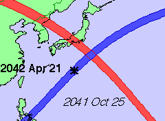 2042年4月20日(日)に孀婦岩で見られる皆既日食世界時間 日本時間 高度 方位 天頂角http://www.hucc.hokudai.ac.jp/~x10553/jp21c/jpt2042.htmlを利用して計算。孀婦岩の皆既継続時間は4分51秒です。 | ![]() |