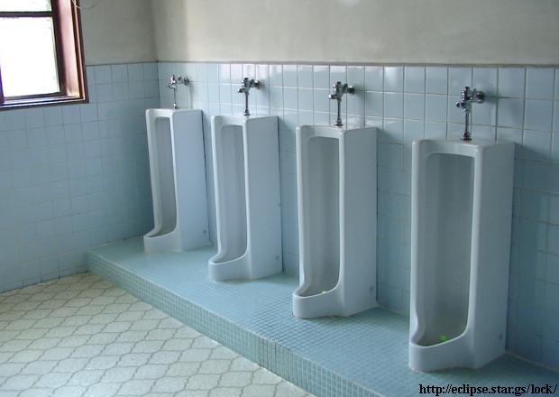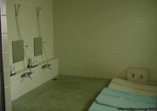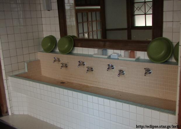 新館の共同浴場は男女別に分かれます。男性客が多いので、3~4人一度に入れる風呂場は男性専用。2人程度は入れる風呂場が女性専用となります。撮影時間が夕方でお客さんもまだいないので、性別の立て札は消火器がある扉の上に置いていました。トイレは男性用がやたら広いです。結構開放的で嬉しいのですが、全て和式トイレです。