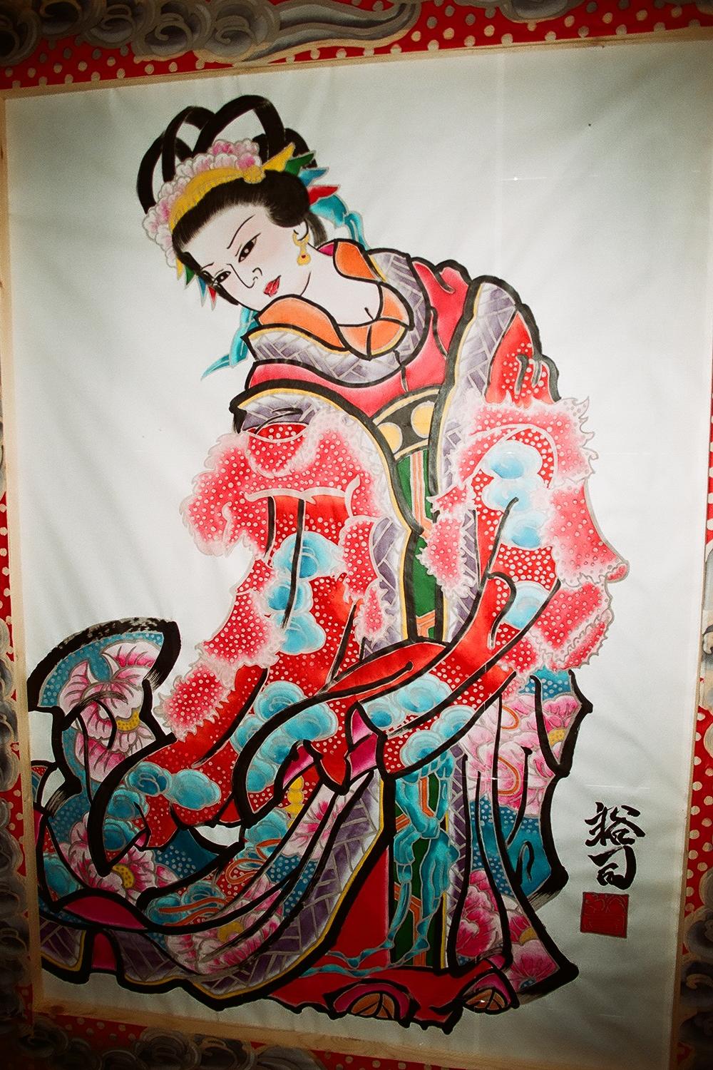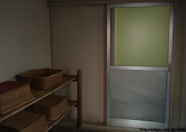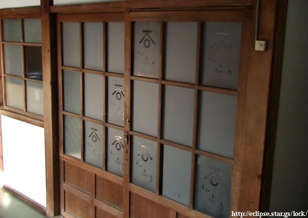 共同の浴場とトイレは一番奥にあります。その途中に、創業当時の屋号が入った飾りガラスがあります。飾りガラスの奥は、新館を立て増しする前に風呂場だったところです。今は物置になっていますが、物置に改築する前は配管が下を通っていたそうです。