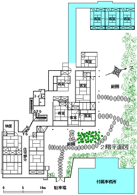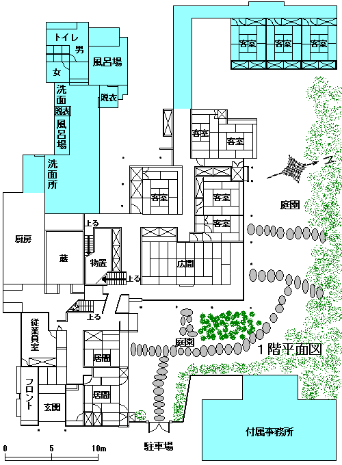 石場旅館は昭和15年に北西側へ増築。昭和30年代に客の要望で現在の間取りに改修後、昭和45年に正面の改装と西側に客室と浴室を増築して現在に至っています。