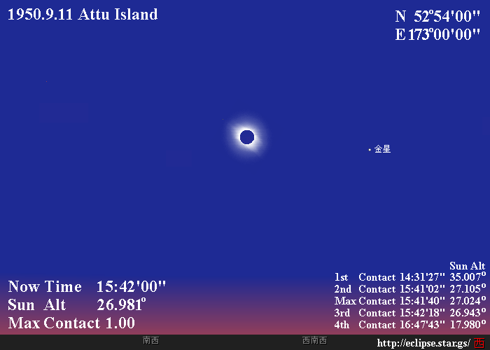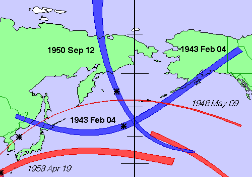 1950年9月11日の皆既日食〔サロス№124…51/73〕は、北極海から極東ロシアを経てアリューシャン列島の最西端に位置するアッツ島にかけて縦断しました。このアッツ島は、第二次世界大戦中に日本軍と米軍の激戦地となった場所です。