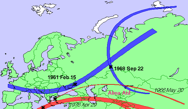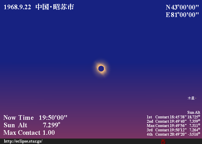 カザフスタンの国境近くにあるジャオスウと言う街では、32秒ほどの皆既日食が起こりました。この日食のサロスは後退期にあり、サロスの中でも最後の皆既日食でした。ソ連領内にあった皆既帯正午中心食で見られた皆既日食の継続時間は、僅か40秒足らずで太陽高度も18.6度でした。