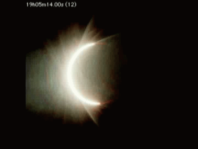 一般に高度10000mの高さで日食を観測すると継続時間が30秒ほど伸びるはずですが、Glenn Schneider氏のサイトで見られた動画によると数秒ほどしか金環皆既日食の継続時間がありませんでした。