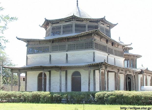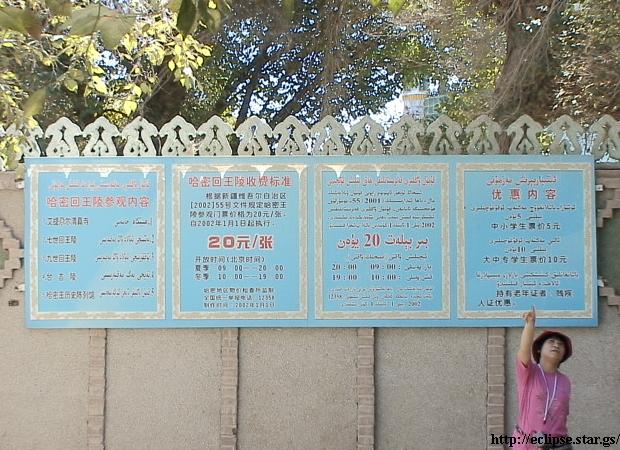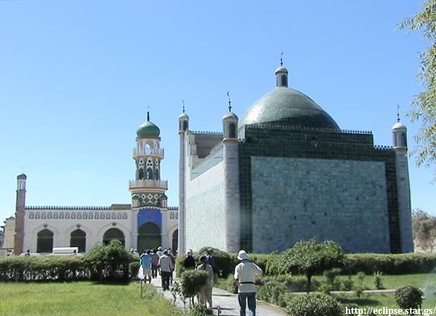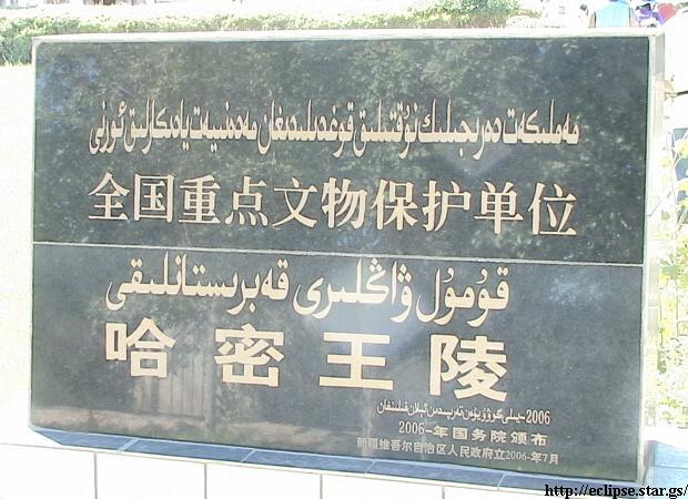炎天下の皆既日食・哈密編4 哈密王墓建築物 (16)哈密郵便局と哈密王墓 哈密王墓へ行く前に哈密郵便局に寄ります。これもツアー企画の際、事前に出しておいた要望です。ここは郵便局が郵政となっていました。日食関連の記念切手が売られていると思ったら、特にそのようなものは売っていないとのこと。北京オリンピックの関連グッズなら売っていました。デザインは北朝鮮政府が好んで使うような感じだったので、買わずにパスしました。全員がバスに乗り、哈密王墓へ向かいます。哈密王墓は一人あたり20元。56人全員が入るので、団体割引が効いたのでしょうか? 「哈密王墓」は「回王墓」とも呼ばれ、敷地の中には歴代ウイグル族の王と一族の石棺が納められた廟があります。エイティガール寺院と呼ばれるモスクがあり、礼拝室の中には赤い柱がずらっと並んで立っていました。館内は撮影禁止ですが、まるで西遊記に出てくる建物のようでした。玄関に書かれていた文字はアラビア文字です。これもアラビア半島から遠い地方にあるので、全て模写で書かれたそうです。何だか模写と言うより、絵のように感じました。モスクの中は結構涼しかったので、ヒトがいなくなるまで粘っていました。直射日光がきつくて乾燥しているので、水で足を冷やしました。 エイティガール寺院の内部:哈密回王墓 より写真を引用 写真と記事は弊ブログ管理者が撮影・執筆しました