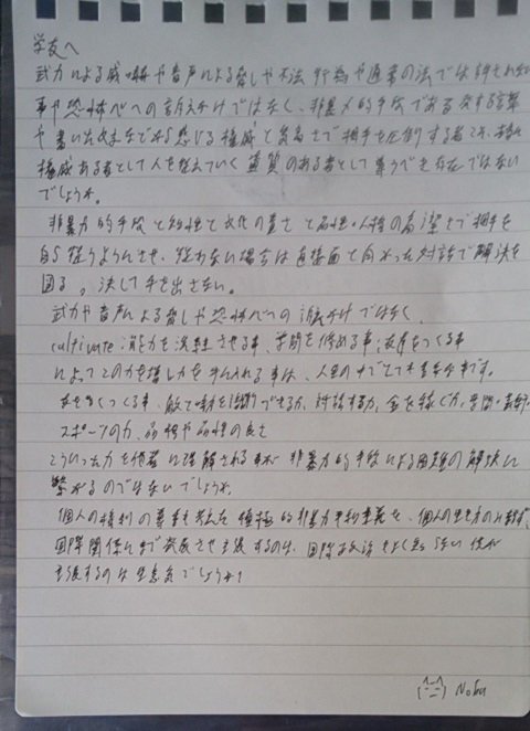 暴力はぼくたちにとってもごく身近なものである。知らず知らずのうちに他者に暴力をふるっているかもしれないからだ。たとえば僕たちは学校で、親しい友人たちとグループを作る。そのときそのグループから排除された他の人々がいる。親しいグループを作るという友愛の行為の背後で、知らないうちに他者を排除し否定する暴力を行使しているかもしれないのだ。