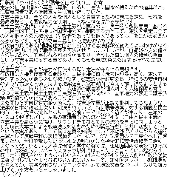 今書いたような事が普通の一般市民として生活したい者の日常に関わる現在の日本国憲法が保障している事です。ですが自民党による憲法改正草案は我々日本国民の日常を脅かすものになりかねないのです。ですから、これから始まる改憲を考える議論においては、政治を議員任せにしていた人を含め、国民の一人一人が健全な人権感覚に基づき、政権の改憲発議を注視し、積極的に言葉と文字と声で意見を表明(ネットでも)していく態度が必要であるように思われます。