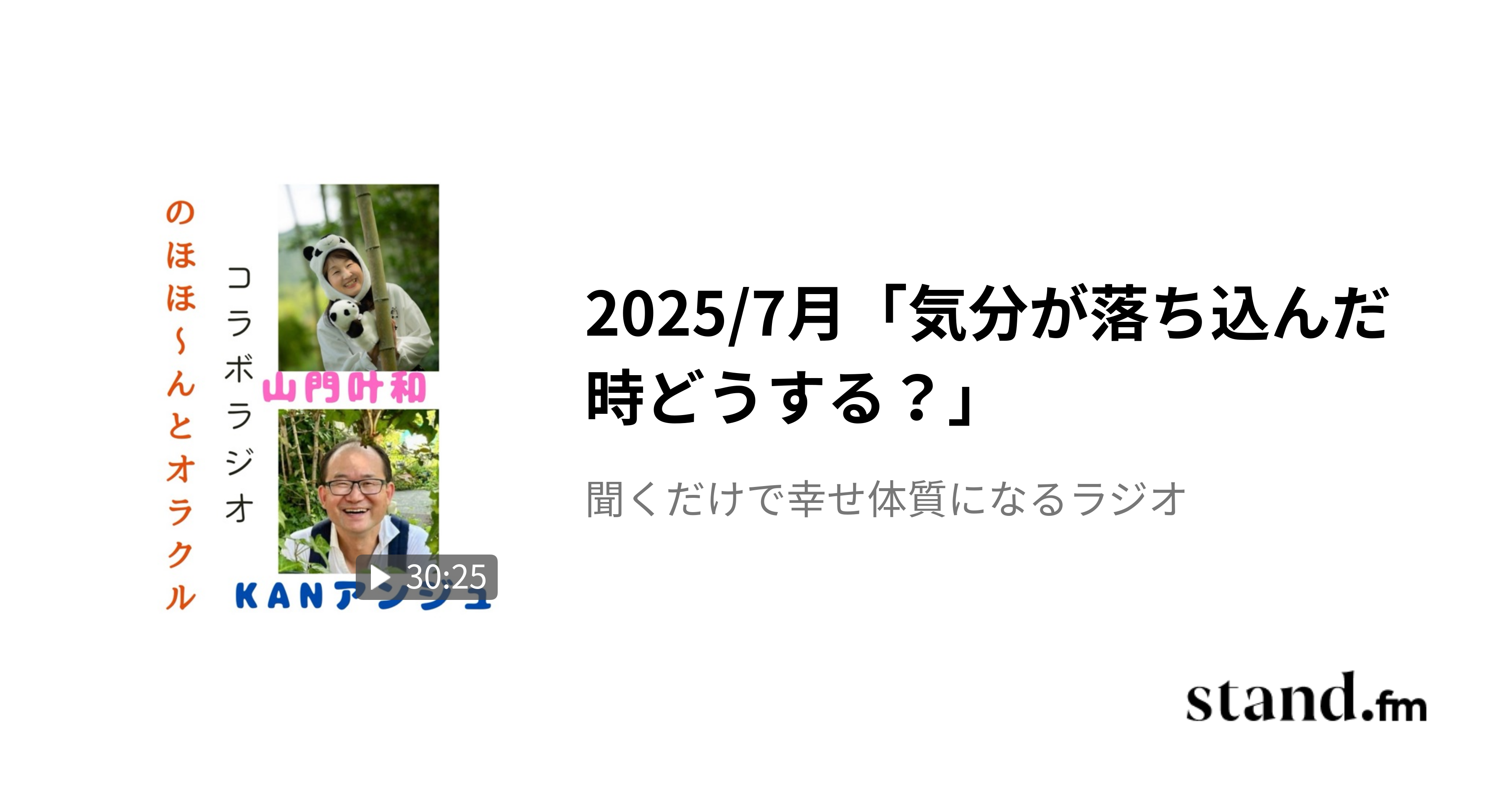 2025/7月「気分が落ち込んだ時どうする?」 - 聞くだけで幸せ体質になるラジオ | stand.fm山門かなわさんこと、ゆっちんと「気分が落ち込んだ時どうする?」というテーマでオラクルカードからのメッセージをお伝えしています😊 山門かなわさんのHP https://reflewaka.hp.peraichi.com/ KanのHP https://mentalclear.jimdoweb.com/ #旅行 #落ち…stand.fm