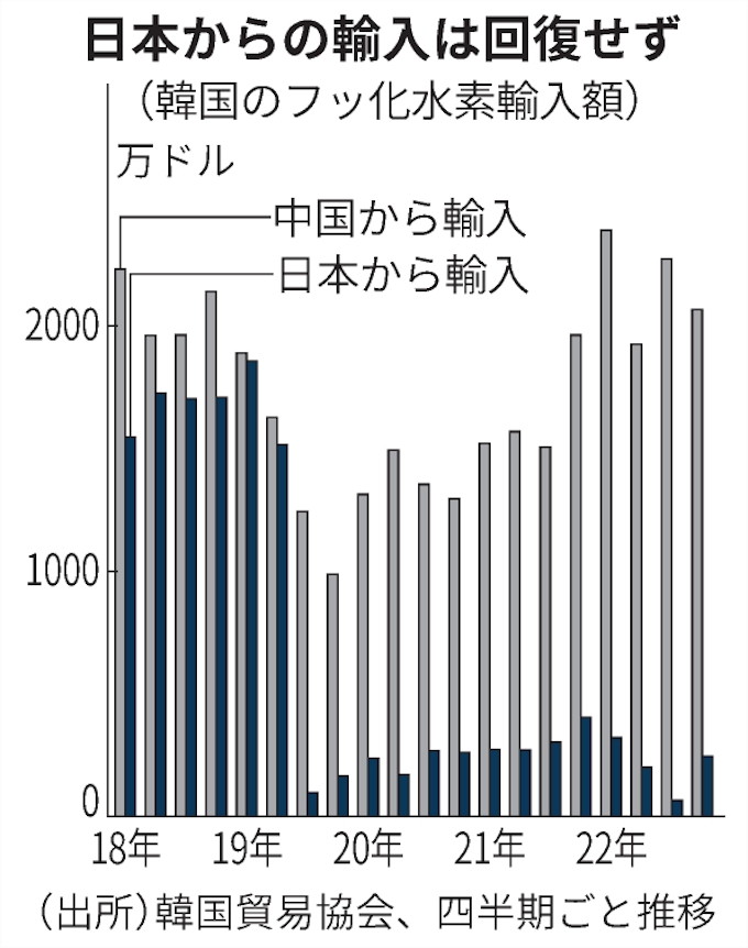 こうした動きで最も影響を受けたのが、管理厳格化対象のフッ化水素だった。韓国貿易協会によると、フッ化水素の日本からの輸入は19年7月に大きく落ち込んだ。数カ月後に日本の輸出許可が出たものの回復せず、22年輸入額は830万ドル(約11億円)と18年比で88%減った。
