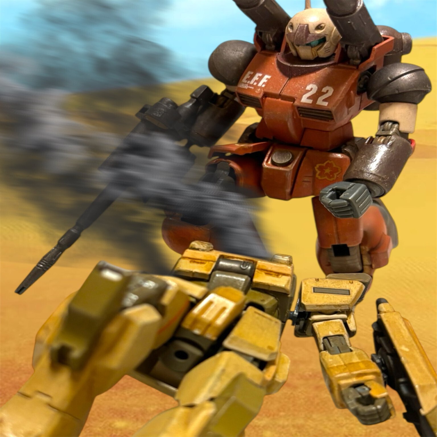 素早く踏み出し、サーベルと左腕のガトリングで巧みに攻めてくる敵機に釘付けにされる。近距離すれすれを攻められ、240mmキャノン砲もビームライフルも、うまく取りまわせない。これでは、仲間の掩護ができない。焦るミヤギの視界に、サンドカラーの見慣れた機体が飛び込んできた。"マスタング"が敵機に体当たりを仕掛け、ガンキャノンから引き離した。