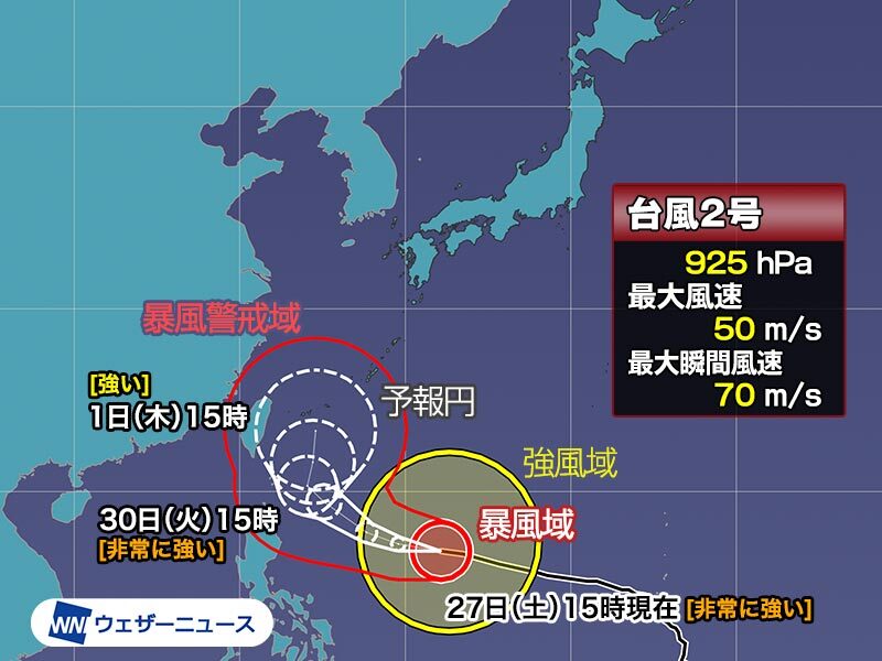 5月27日(土)15時現在、非常に強い勢力の台風2号(マーワー)はフィリピンの東の海上で強風域の範囲を拡大し、大型になりました。
