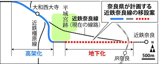 計画では、大和西大寺駅とその周辺の線路を高架化した上で、宮跡を横切る線路は宮跡南側へ移設し、宮跡南から近鉄奈良駅までの区間を地下化することで8カ所の「開かずの踏切」を解消。宮跡南の朱雀大路への新駅設置も検討していた。