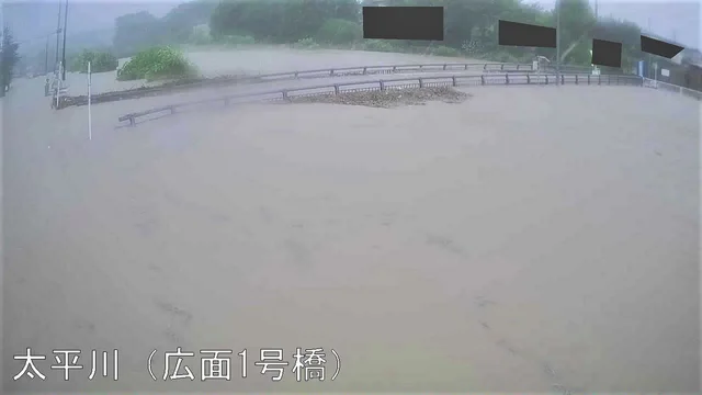 秋田市の市街地を流れる太平川が氾濫し。橋も濁流に沈んでいる=15日午後3時、秋田市広面の県河川カメラ