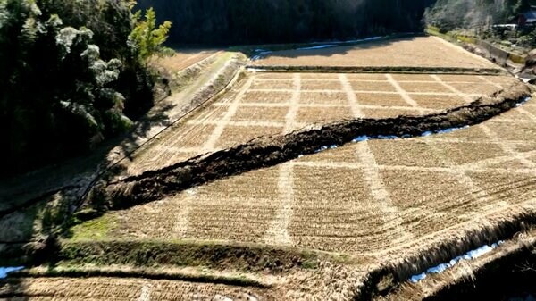 まるで崖のように地面が盛り上がった田んぼ。家や川を横切り、道路を分断するように、隆起が全長約4kmに渡っている。