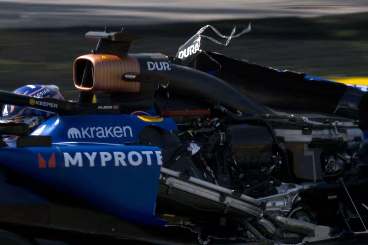 ウィリアムズのアルボンのマシン、エンジンカウルが吹き飛んだぞ。多分、風圧だな。残り5分30秒で赤旗となった。