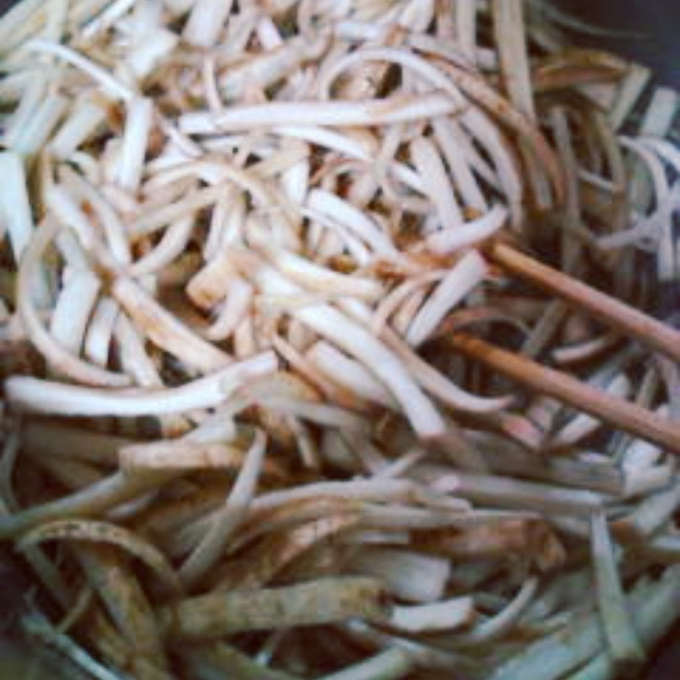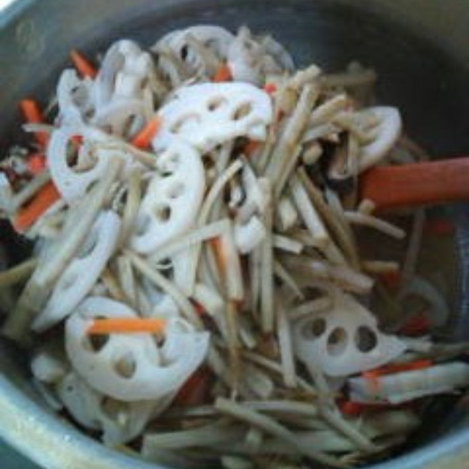 鍋に油を熱し、ごぼうを炒める。油が回ったら、残りの1番を入れ炒める。途中、水分がなくなったら、干し椎茸の戻し汁を足してください。