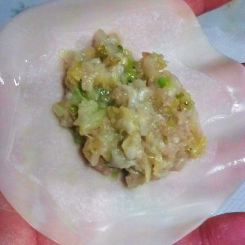 ぎょうの皮の中央にたねを起き、周りに水を付けて、