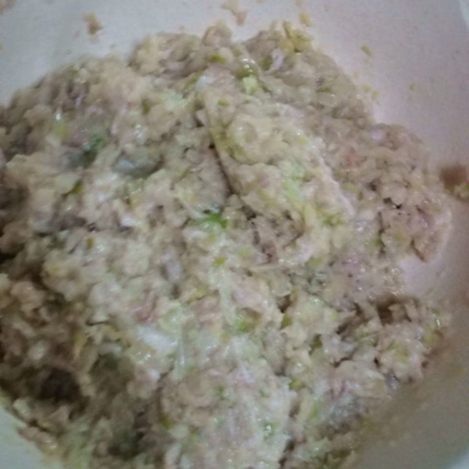 にんにく→豚バラ肉→キャベツの順で、フードカッターに入れ、みじん切りにします。全部をボールに入れ、塩コショウ、ごま油を入れて、粘りが出るまでこねます。