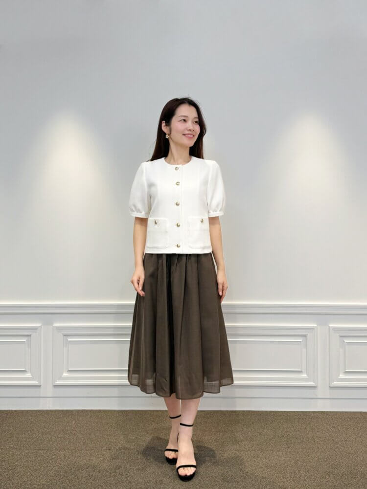 穏やかな春の空気に寄り添う、気品と軽やかさを兼ね備えたスタイリング。清潔感のあるホワイトツイードジャケットに、深みのあるブラウンワンピースを重ねることで、柔らかなコントラストが生まれます。立体感のあるフォルムと繊細なプリーツの対比が装いに奥行きを与え、静かな存在感を演出。足元は黒のサンダルで引き締め、端正さの中に程よい抜け感を添えました。