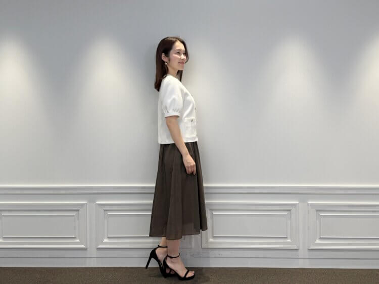 きちんと感のあるツイード素材に、ふんわり広がるティアードデザイン。腰まわりを自然にカバーしながら、女性らしいシルエットを演出してくれます。ママ目線でいうと、“体型カバーできるのにきちんと見える”のは本当にありがたいポイントです。