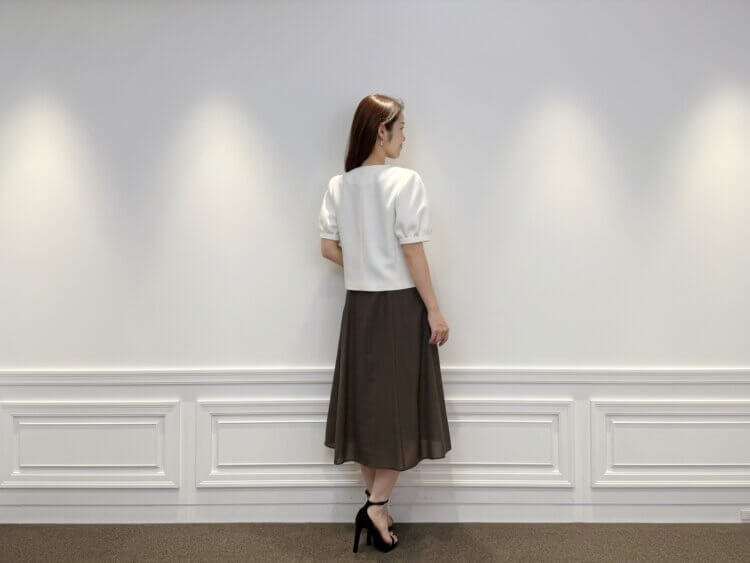 インナーにはティアードカフスポンチカットソーを。袖口のさりげないデザインが、ジレを重ねたときにちらっと見えて可愛いんです。ポンチ素材なので動きやすく、撮影や展示会でバタバタする日にもストレスフリー。プこんにちは。