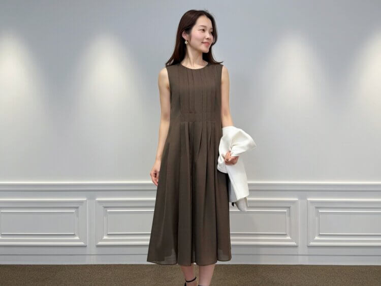 <プリーツデザインノースリーブワンピース>は、“繊細なプリーツデザインが上品な印象を与えるノースリーブワンピース。身体のラインを美しく見せるシルエットで、一枚でも華やかに着こなせます。”という一着。ブラウンの落ち着いた色味が全体に深みをもたらし、甘さに傾きすぎない大人の女性らしさを演出。歩くたびに揺れるプリーツが軽やかな余韻を残し、ジャケットを脱いだ後も完成度の高い佇まいを保ちます。