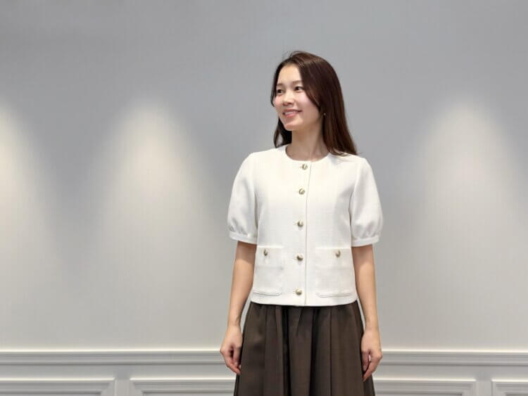 これからの季節に羽織るだけできちんと感が出て、お仕事シーンや食事会などで上品に魅せてくれる半袖のツイードジャケット。
