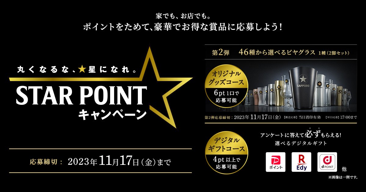 STAR POINT キャンペーン | サッポロビール家でも、お店でも。ポイントをためて、豪華でお得な賞品に応募しよう!第1弾はWILDSIDE YOHJI YAMAMOTOとサッポロ生ビール黒ラベルとのコラボレーションTシャツが抽選で5,000名様に当たる!c-kurolabel.jp