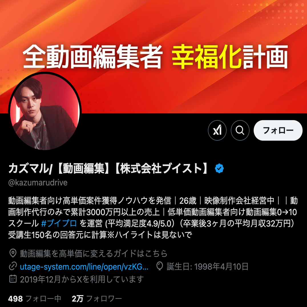 カズマルさんは、動画編集の分野で活動する起業家であり、ブイプロの運営者です。