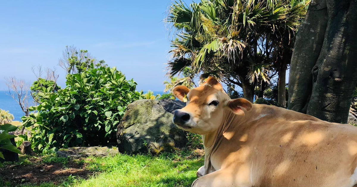 八丈島乳業の直営牧場である「ゆーゆー牧場」では、2017年から全日本・食学会と提携してジャージー牛の雄牛を育成しています。生後半年はゆーゆー牧場でスタッフが愛情を持って育て、その後、八丈町営富士牧場に預託して広々とした八丈富士の牧野で約3年半の自然放牧が行われます。この間もゆーゆー牧場スタッフが毎月体重測定や飼料の確認などを行っています。4年間以上の放牧期間が終了すると、ジャージー牛は八王子の磯沼ミルクファームへ送られ、肉牛としての肥育仕上げが行われます。ゆーゆー牧場では、生まれた命が最後まで無駄になることなく、多くの人々の喜びとなることをスタッフ一同が願っています。