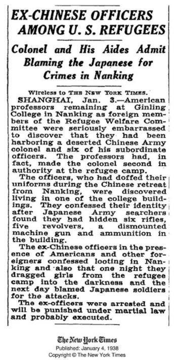 アメリカ人や他の外国人の前で、元中国将校たちは、南京での略奪を自白した。また、ある晩、難民キャンプから少女たちを暗闇に引き込み、翌日、その襲撃の責任を日本兵に負わせたことも自白した。