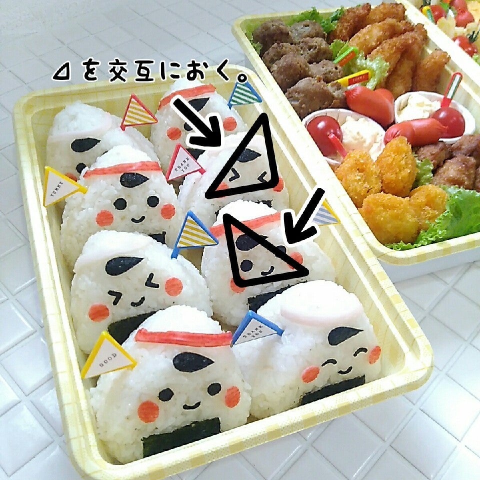三角おにぎりではなく、直角三角形おにぎりにすることで皆の顔が見えるだけでなく、動きもプラス♡